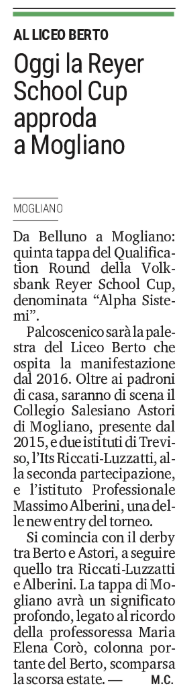 In questa occasione si sfideranno i padroni di casa del Liceo Berto (Mogliano), che partecipano al torneo dal 2016 (anno in cui hanno raggiunto le Final Four), il Collegio Salesiano Astori sempre di Mogliano Veneto, presente dal 2015, e due istituti di Treviso: l’ITS Riccati-Luzzatti, alla seconda partecipazione, e l’Istituto Professionale Massimo Alberini, new entry del torneo.