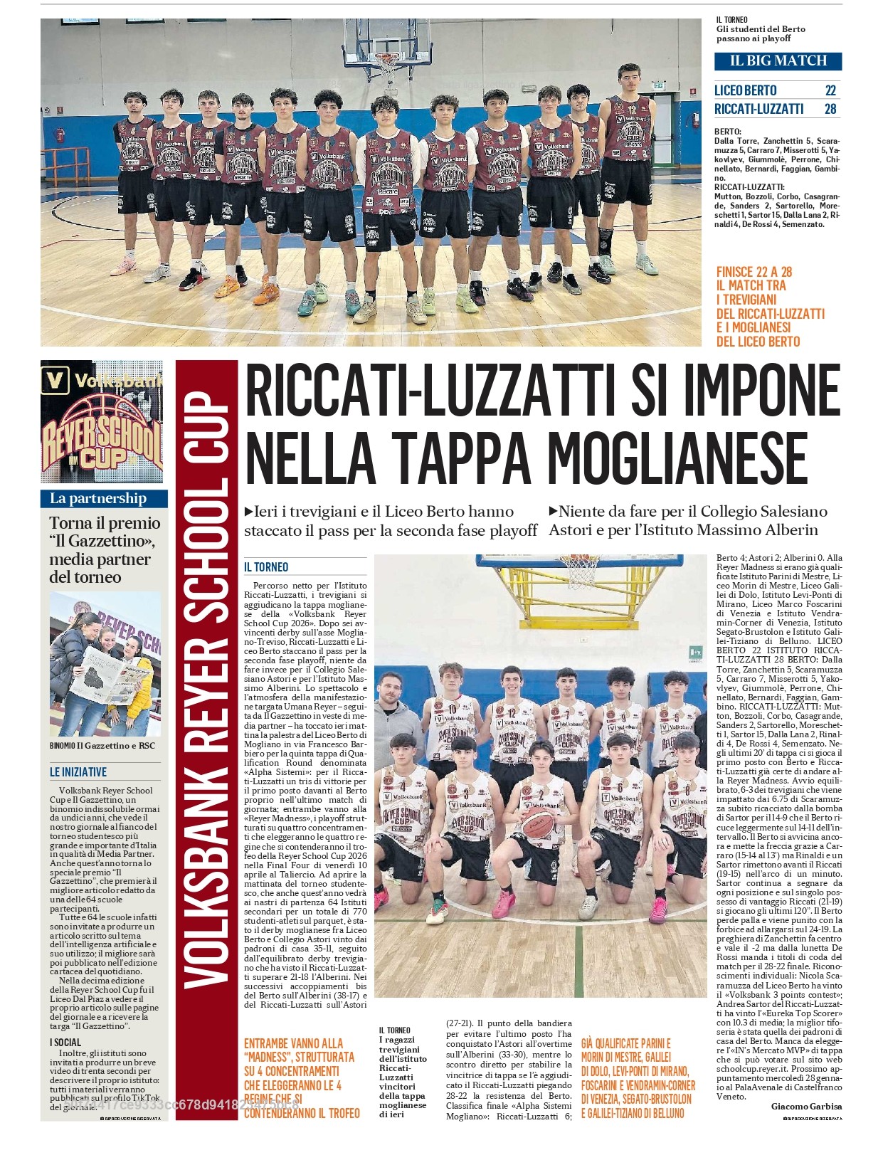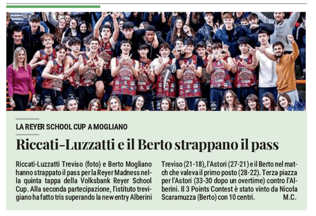 Next stop: mercoledì 28 gennaio presso il Palavenale a Castelfranco Veneto. Si gioca per il round 6 della Volksbank Reyer School Cup, denominata “Vivimondo”. In gara gli istituti: Galilei-Barsanti (Castelfranco Veneto), Max Planck (Treviso), Giorgione (Castelfranco Veneto), Meucci (Cittadella).