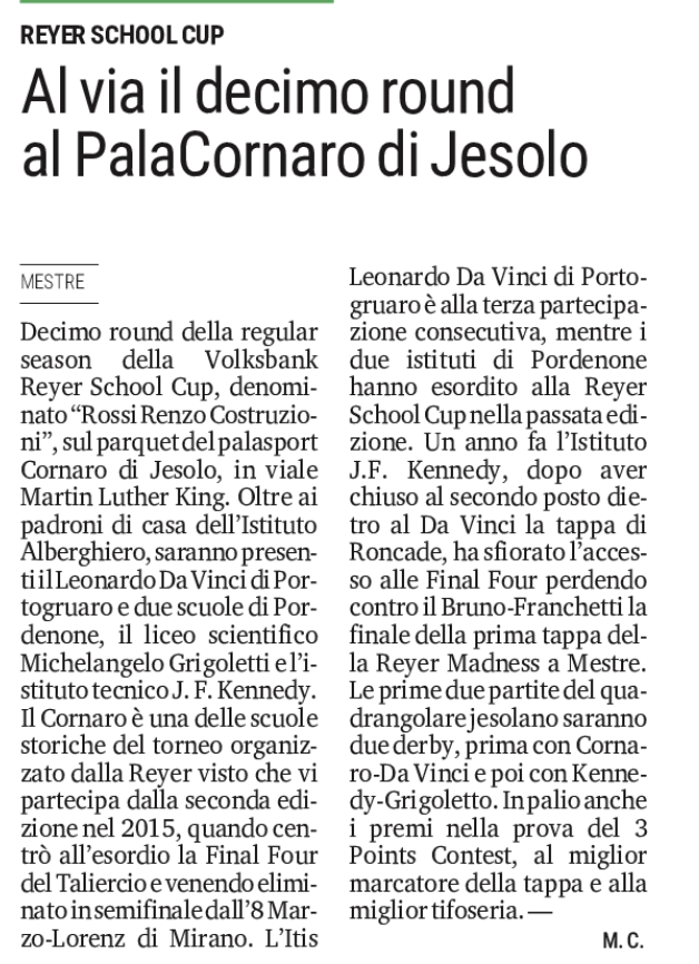 Next Stop: Venerdì 13 febbraio presso il Pala Cornaro di Jesolo si gioca il round 10 della Volksbank Reyer School Cup, denominata “Rossi Renzo Costruzioni”. In gara gli istituti: Grigoletti (Pordenone), Kennedy (Pordenone), Da Vinci (Portogruaro) e i padroni di casa del Cornaro (Jesolo).