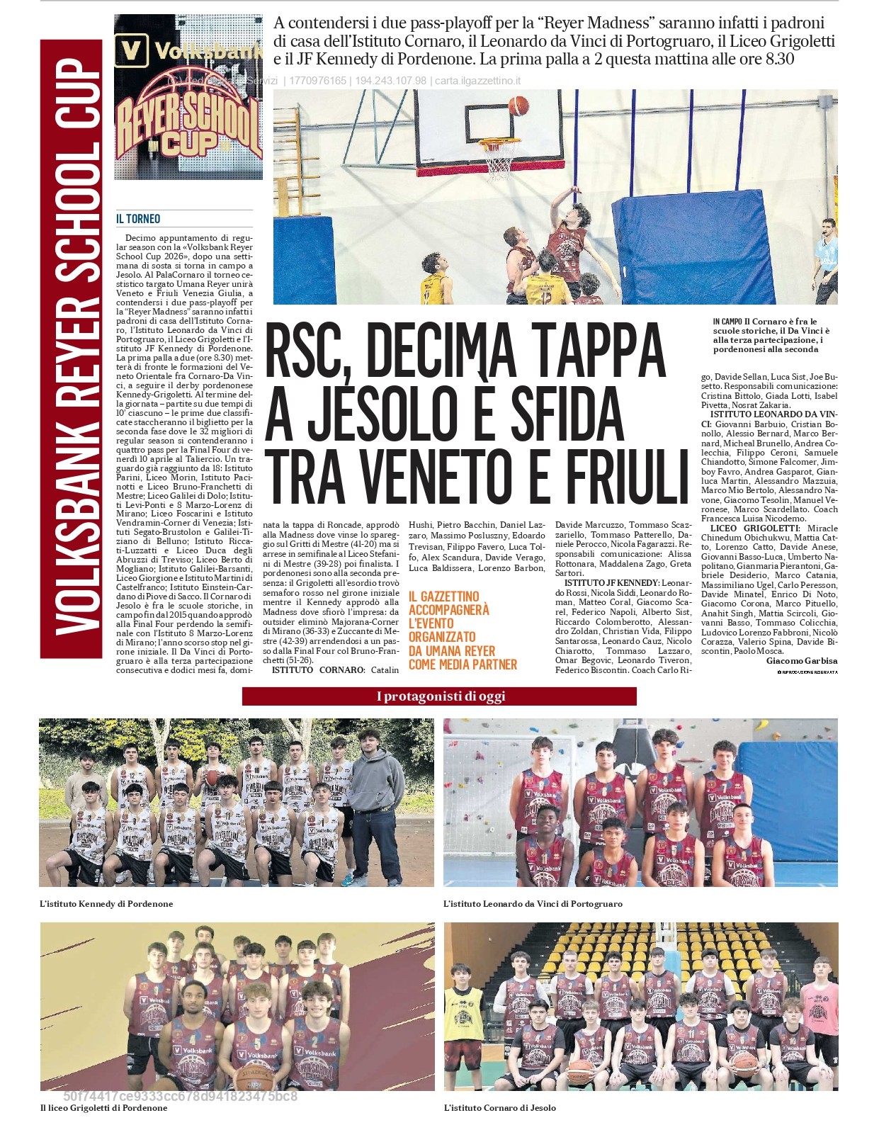 Al Palasport Cornaro di viale Martin Luther King a Jesolo si è alzato il sipario sul round 10 della Volksbank Reyer School Cup 2026, denominata “Rossi Renzo Costruzioni”. A contendersi i due pass per la RB Care Reyer Madness sono stati: i padroni di casa dell’istituto alberghiero Cornaro, due istituti di Pordenone (il Grigoletti e il Kennedy) e i ragazzi dell’istituto Da Vinci di Portogruaro. Al termine di una serie di sfide intense, giocate con lo spirito che contraddistingue il torneo scolastico Reyer, a trionfare è il Kennedy di Pordenone grazie alla vittoria in un meraviglioso “Game 6”, terminato 31-30 contro il Da Vinci di Portogruaro, che comunque stacca il pass per le Madness come secondo classificato.