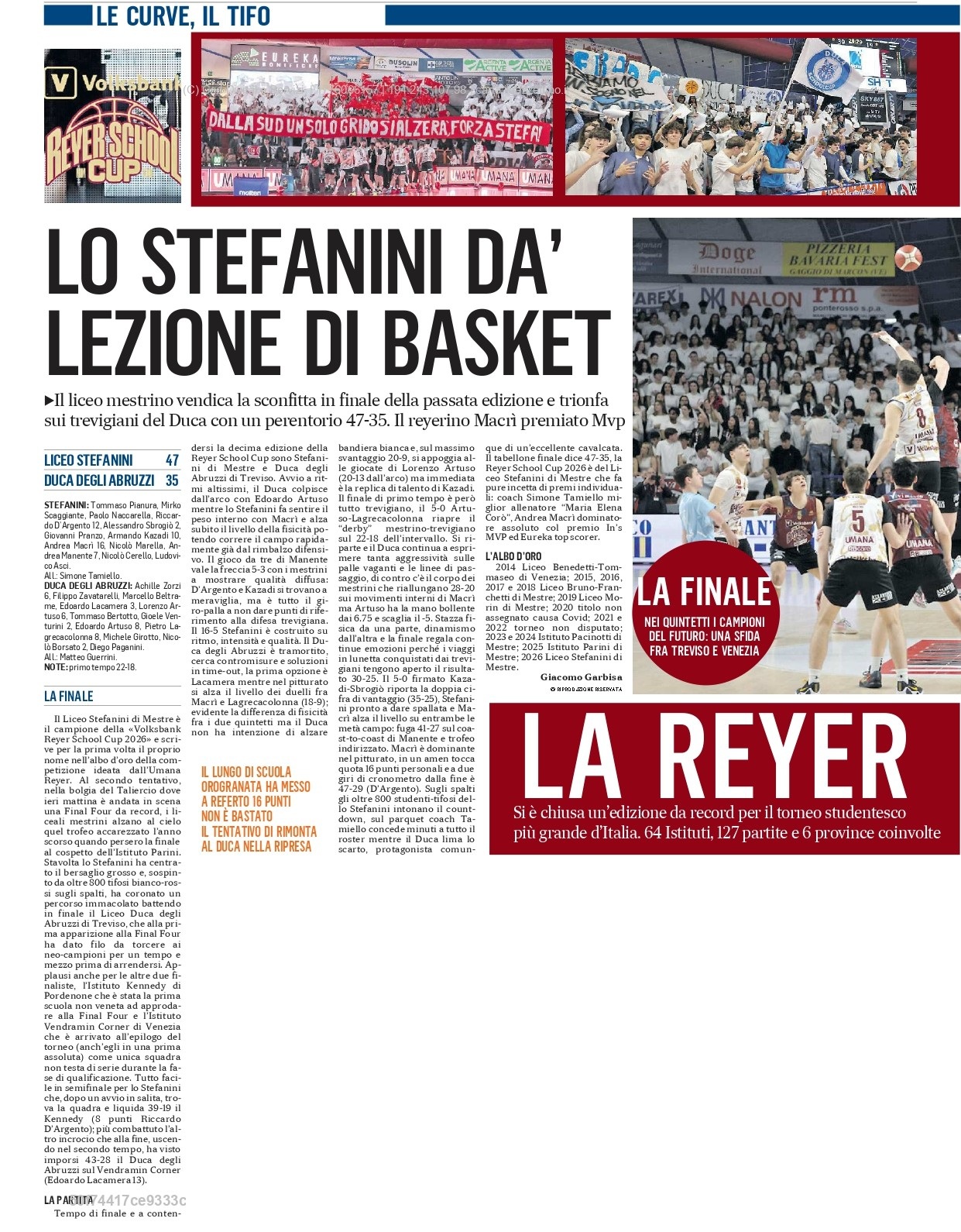 Il Liceo Stefanini di Mestre batte il Liceo Duca degli Abruzzi di Treviso per 47-35, in una gara di fatto dominata dal primo all’ultimo minuto. Ben tre giocatori in doppia cifra per i mestrini: i 16 punti di Andrea Macrì (top scorer ed MVP delle Final Four), i 12 di Riccardo D’Argento e i 10 di un devastante Armando Kazadi.