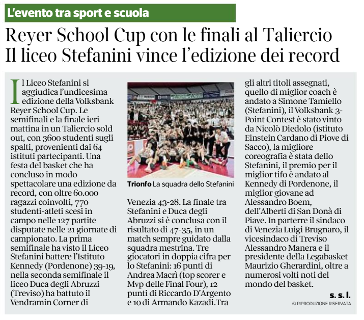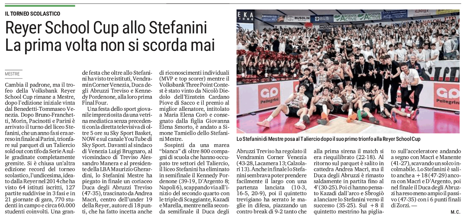 Il meraviglioso viaggio dell’undicesima edizione della Volksbank Reyer School Cup, il torneo scolastico di pallacanestro più grande d’Italia, termina con il trionfo dello Stefanini di Mestre, che in finale piega il Duca degli Abruzzi dopo 20 minuti di gara straordinari.