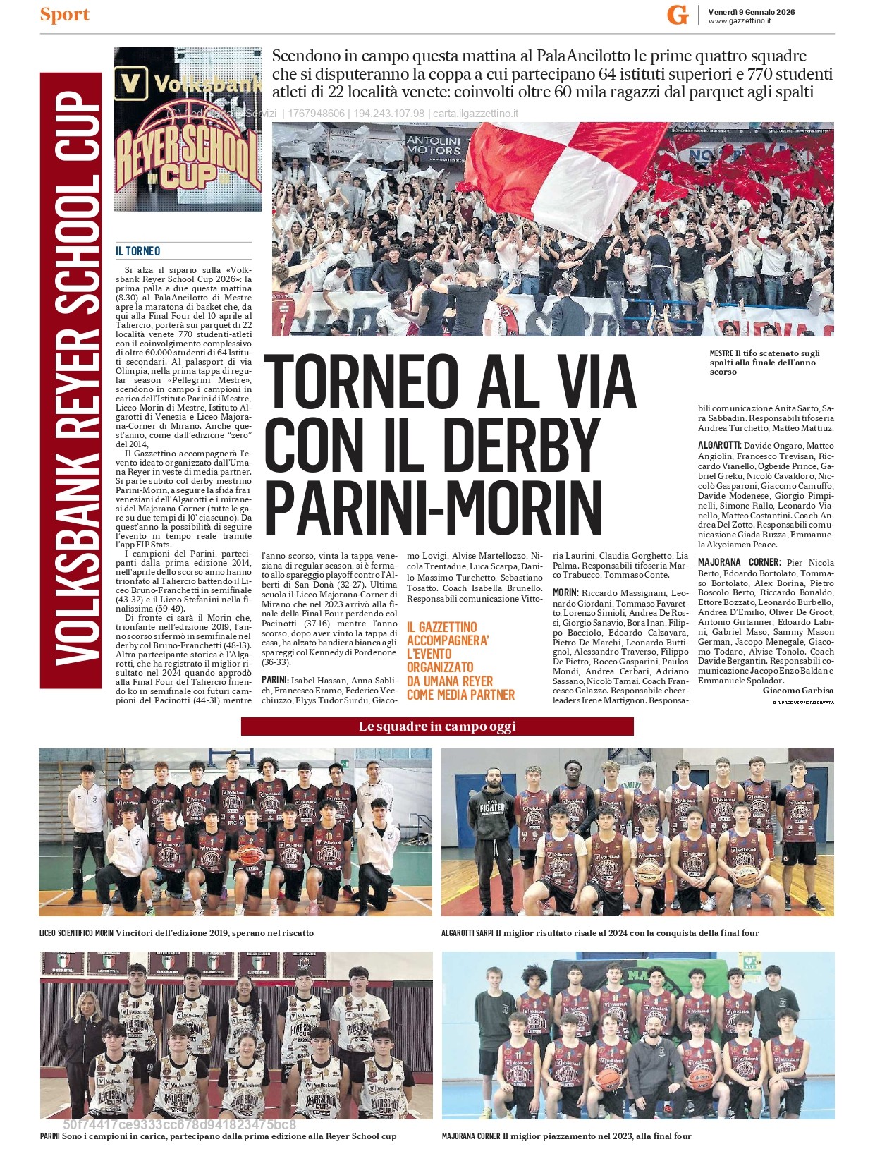 È tempo di alzare il sipario sulla Volksbank Reyer School Cup 2026 giunta alla sua undicesima edizione. Venerdì 9 gennaio dalle 8.30, per la prima palla a due, gli studenti degli Istituti Mestrini Parini e Morin oltre l’Algarotti di Venezia e il Majorana-Corner di Mirano esordiranno nel torneo scolastico di pallacanestro organizzato dall’Umana Reyer, il più grande d’Italia.