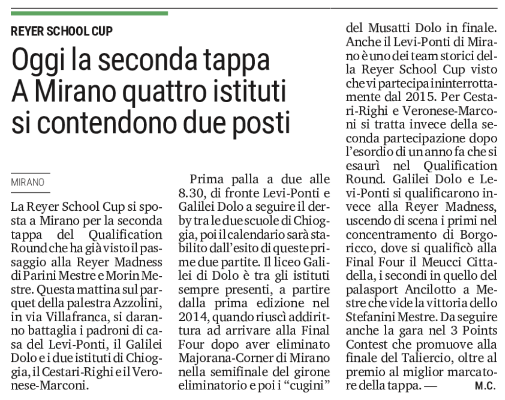Archiviata la prima tappa della Volksbank Reyer School Cup, altre grandi emozioni per il secondo appuntamento del prestigioso torneo scolastico. Sul rettangolo di gioco, presso il Palazzetto dello Sport di via Azzolini a Mirano, sono scesi in campo due istituti di Chioggia, il Cestari-Righi e il Veronese-Marconi, oltre al Galilei di Dolo e i padroni di casa del Levi-Ponti. Al termine di sei gare emozionanti trionfa il Galilei di Dolo guidato dal top scorer Luca Costalunga. Al secondo posto si piazza il Levi-Ponti di Mirano.