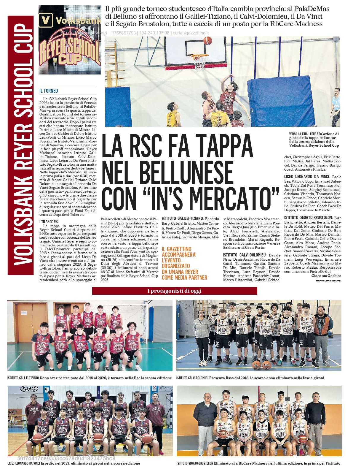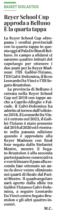 Next stop: Martedì 20 gennaio al Palasport De Mas di Belluno. Si gioca per il round 4 della Volksbank Reyer School Cup, denominata “IN’s Mercato”. In gara gli istituti: Galilei-Tiziano (Belluno), Calvi-Dolomieu (Belluno), Da Vinci (Belluno), Segato-Brustolon (Belluno).