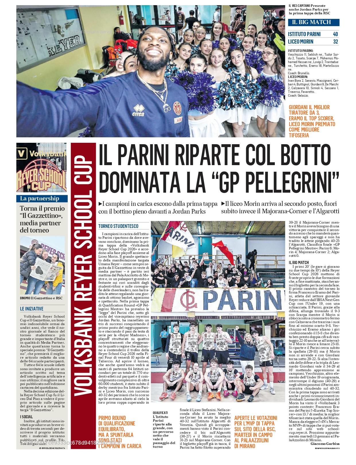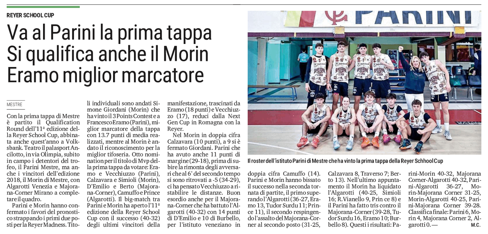 Si è alzato nuovamente il sipario sulla Volksbank Reyer School Cup per la stagione 2026, giunta alla sua undicesima edizione. Il primo round ha visto il trionfo del Parini di Mestre, che ha fatto percorso netto vincendo tutte le tre partite giocate. Al secondo posto si piazza il Morin, sempre di Mestre.
